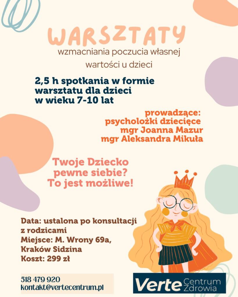 Zapraszamy dzieci w wieku 7-10 lat na warsztaty wzmacniające poczucie własnej wartości. To 1,5 godziny pełne zabawy i doświadczenia, dostosowane do wieku uczestników i ich potrzeb. Interaktywna formuła pozwoli dzieciom zdobywać nowe umiejętności, a przy tym dobrze się bawić.